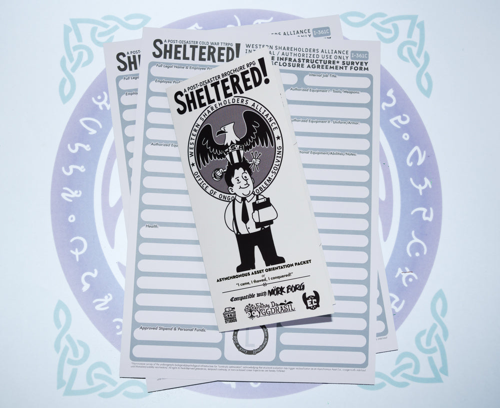 Sheltered! é o equivalente em RPG de ação e aventura a encontrar um formulário de "Pesquisa de Infraestrutura de Rotina" que, na verdade, é um contrato vinculativo de criostase. É desleixado, engraçado e provavelmente não é uma violação da OSHA. Jogue, modifique e ajuste ao seu gosto, ria da distopia e lembre-se: o progresso prevalece!