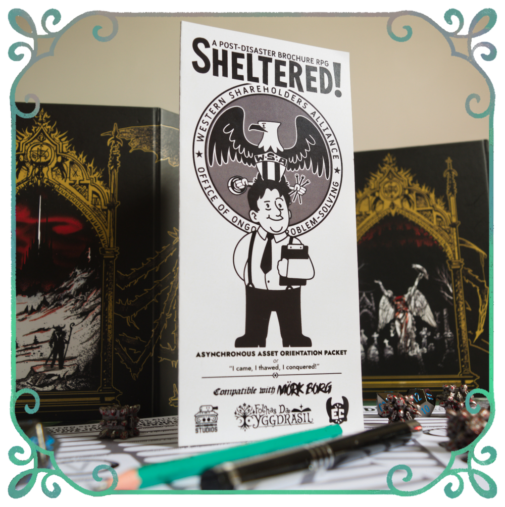Imagine Fallout se o apocalipse fosse terceirizado para uma joint venture entre Michael Scott e Leslie Knope. Sheltered! é esse sonho febril – um RPG de ação e aventura legalmente distinto e compatível com MÖRK BORG, que reúne capitalismo nuclear, jargões distópicos de escritório e caos criogênico em um único folheto triplo.